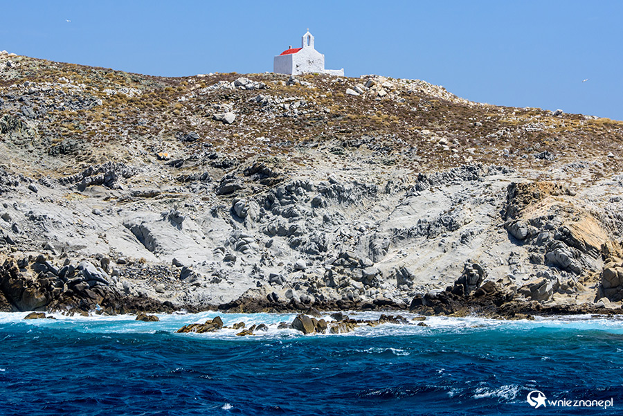 Mykonos. Surowe, skaliste wybrzeże wyspy widziane podczas rejsu na Delos. - foto: wnieznane.pl