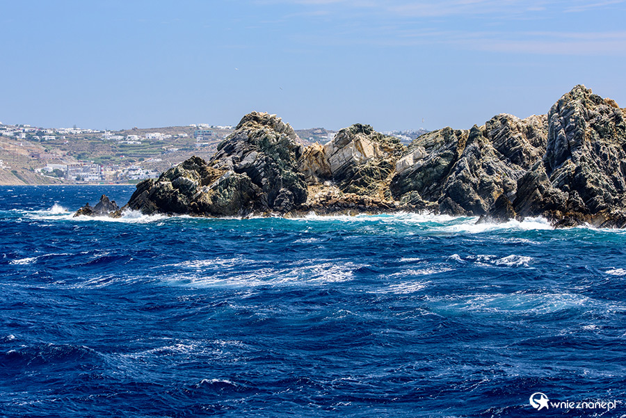 Mykonos. Skaliste wybrzeże wyspy widziane podczas rejsu na Delos. - foto: wnieznane.pl