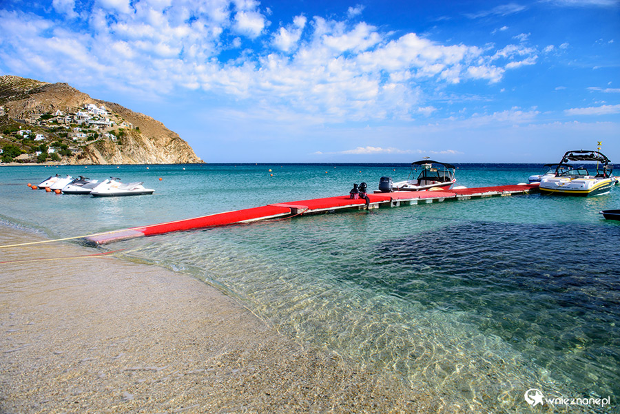 Mykonos. Pomost dla statków wycieczkowych i baza do uprawiania sportów wodnych przy plaży Elia. - foto: wnieznane.pl