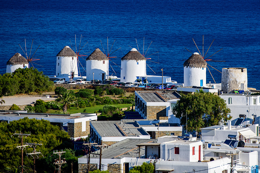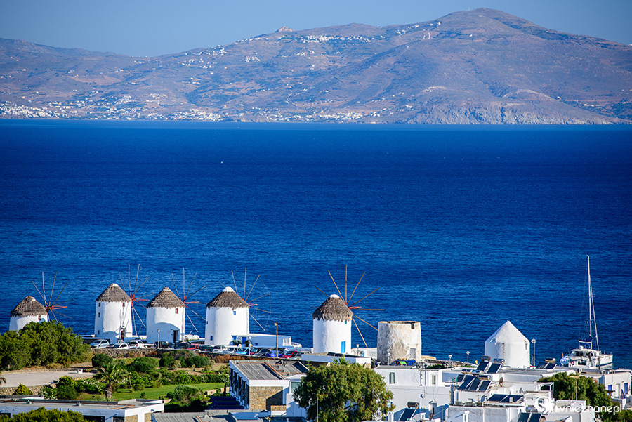 Mykonos. Słynne wiatraki w stolicy wyspy. W tle wyspa Tinos.