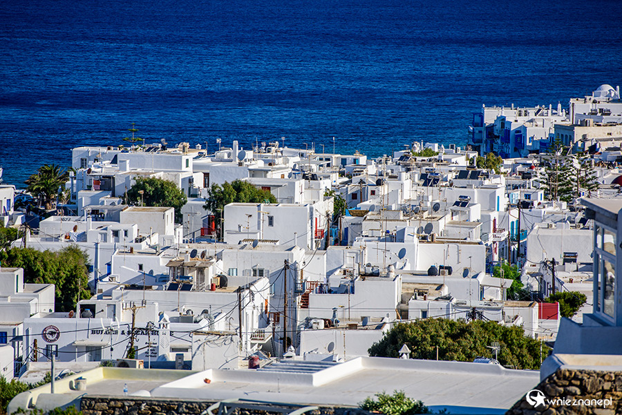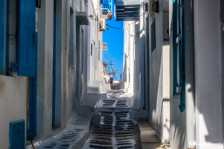Mykonos. Zwarta, biała zabudowa i ciasne uliczki tworzące labirynt - tak wygląda stolica wyspy. W głębi wiatraki.
