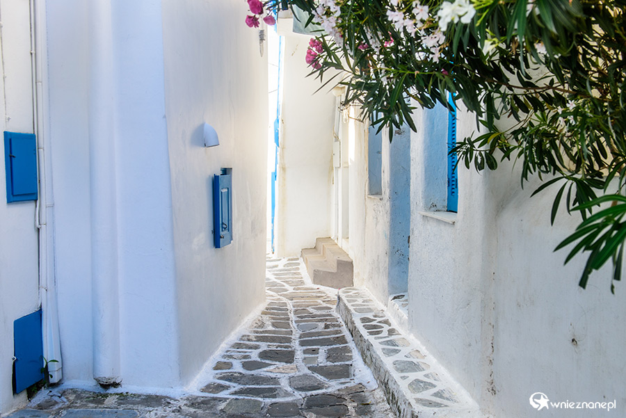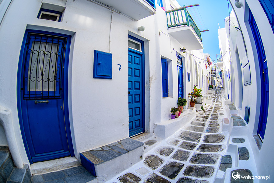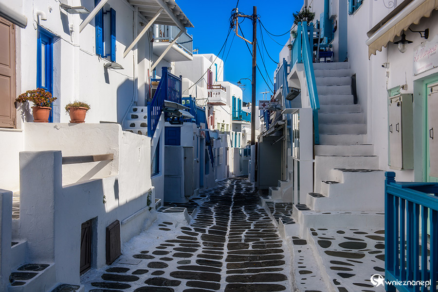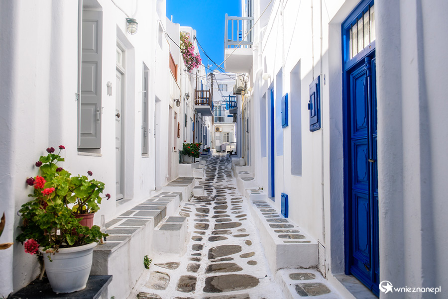 Mykonos. Białe cykladzkie domy i wąskie uliczki w stolicy wyspy.