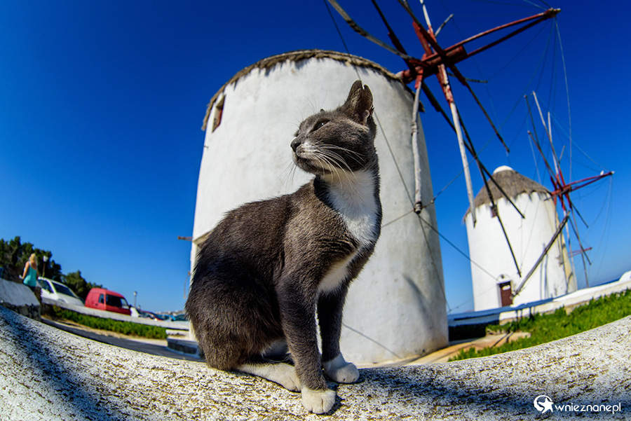 Mykonos. Koty są często spotykane na Mykonos, ale nie w takiej dużej liczbie, jak na niektórych innych wyspach.