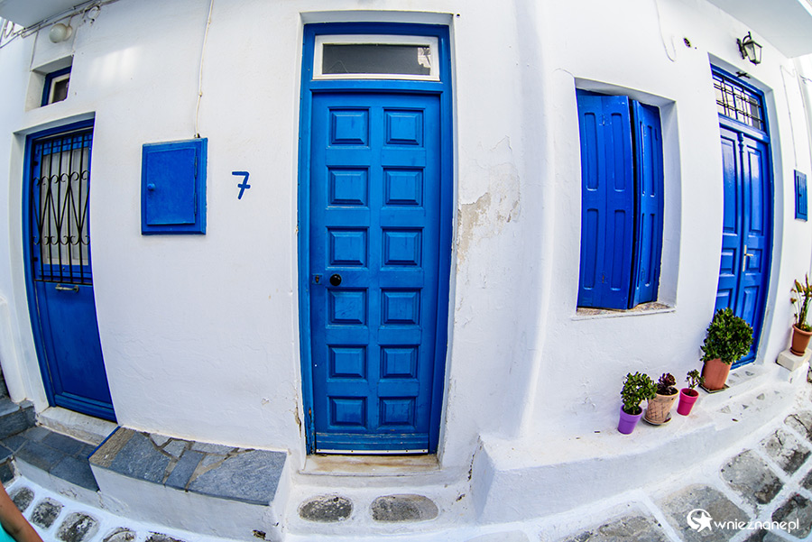 Mykonos. Białe budynki i niebieskie albo czerwone dodatki - typowy cykladzki styl dostrzegamy na wyspie na każdym kroku.