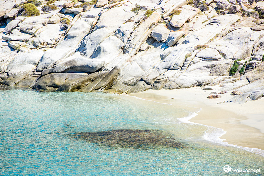 Mykonos. Położona w południowo-zachodniej części wyspy plaża Kapari otoczona jest jasnymi, gładkimi skałami.