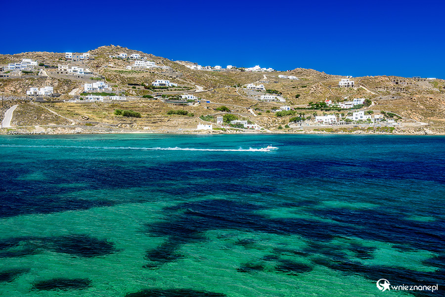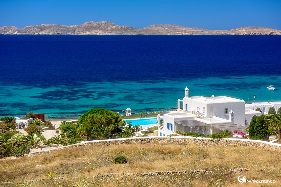 Mykonos. Południowo-zachodnia część wyspy zabudowana jest głównie przez ekskluzywne wille i hotele.
