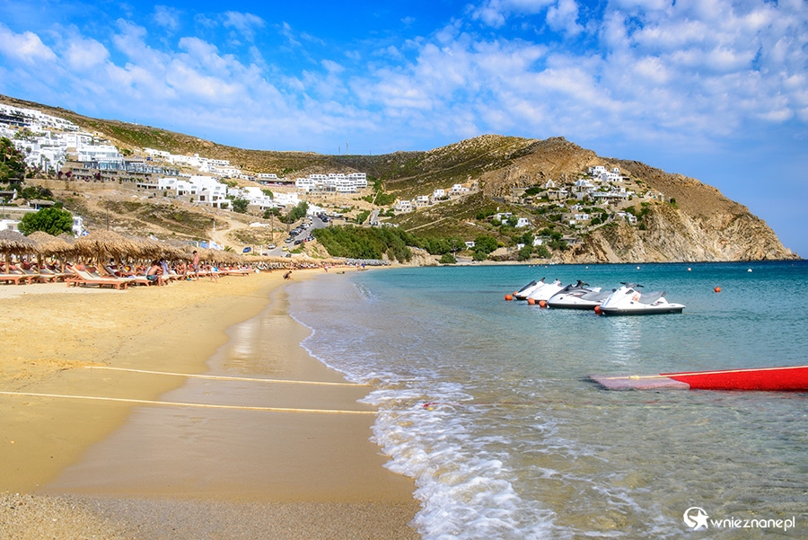 Mykonos. Piaszczysta plaża Elia Beach na południu wyspy.