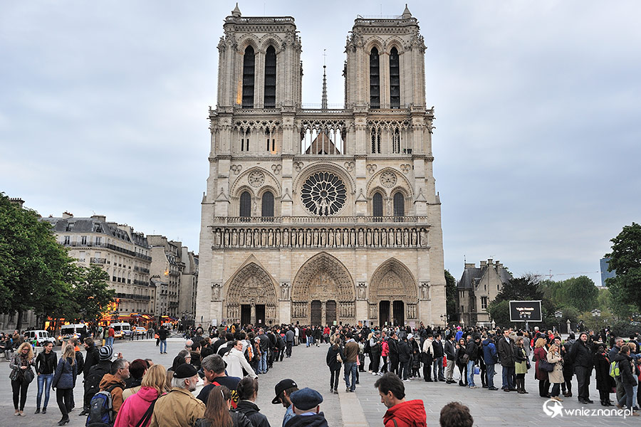 Paryż. Katedra Notre-Dame i długa kolejka oczekujących do wejścia.