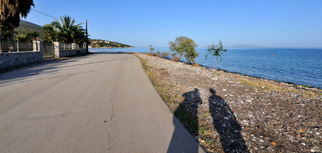 Z Epidavros ruszamy drogą wzdłuż wybrzeża w kierunku Aten. Widoki są wspaniałe, a my losowo wybieramy jedną zatoczkę, w której postanawiamy popływać. Plaża jest niemal pusta, ale woda wciąż jest nagrzana po lecie i spokojnie można się kąpać. Bezpośrednio na piasku ustawione są stoliki należące do okolicznych tawern, decydujemy się więc na późny obiad nad samym brzegiem morza. Jedzenie może nie jest szczególnie tanie, ale dania są duże i przede wszystkim smaczne. Zapada już zmrok, kiedy kierujemy się z powrotem do Aten.