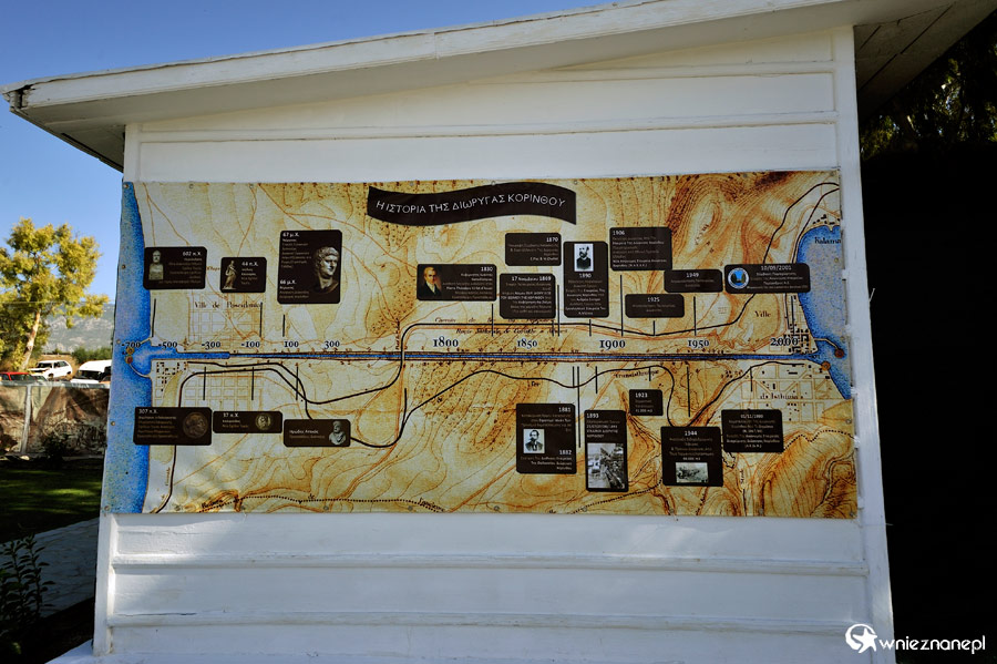 Peloponez. Tablica pokazująca parametry Kanału Korynckiego.