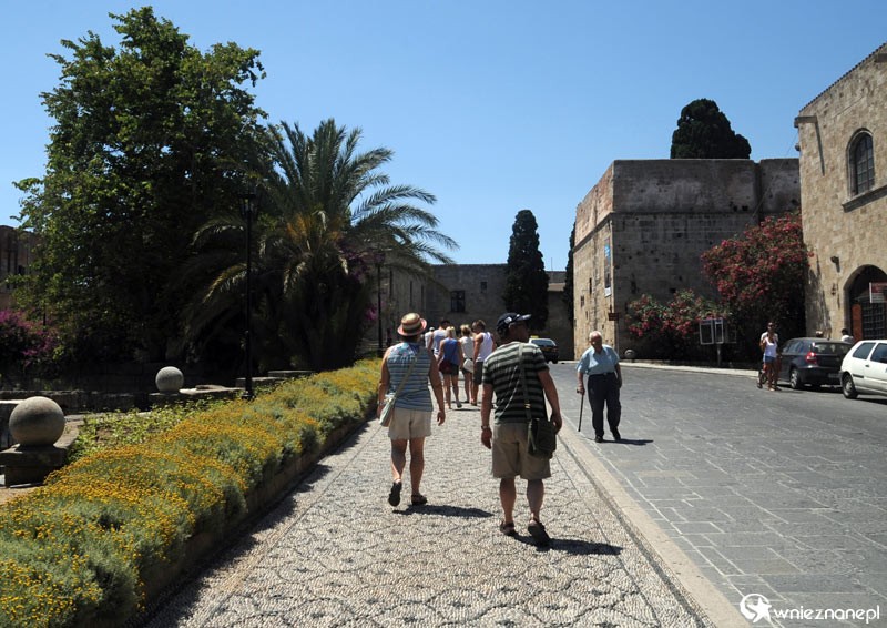 Wyspa Rodos. Spacer jedną z uliczek Starego Miasta w Rodos. Uwagę zwraca charakterystyczna kamienna mozaika tworząca chodnik.