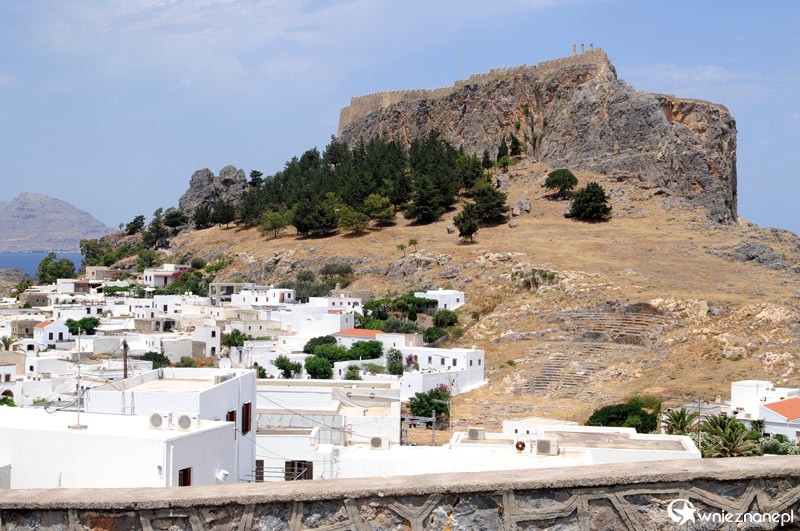Wyspa Rodos. Tradycyjne greckie domy w Lindos. W tle monumentalny Akropol na wzgórzu. - foto: wnieznane.pl