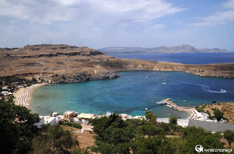 Wyspa Rodos. Widok z ruin Akropolu na przepiękną Zatokę Lindos.