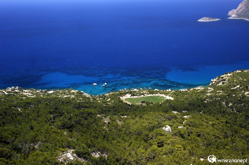 Wyspa Rodos. Widok z góry, z zamku Monolithos na przepięknego koloru wody Morza Egejskiego.