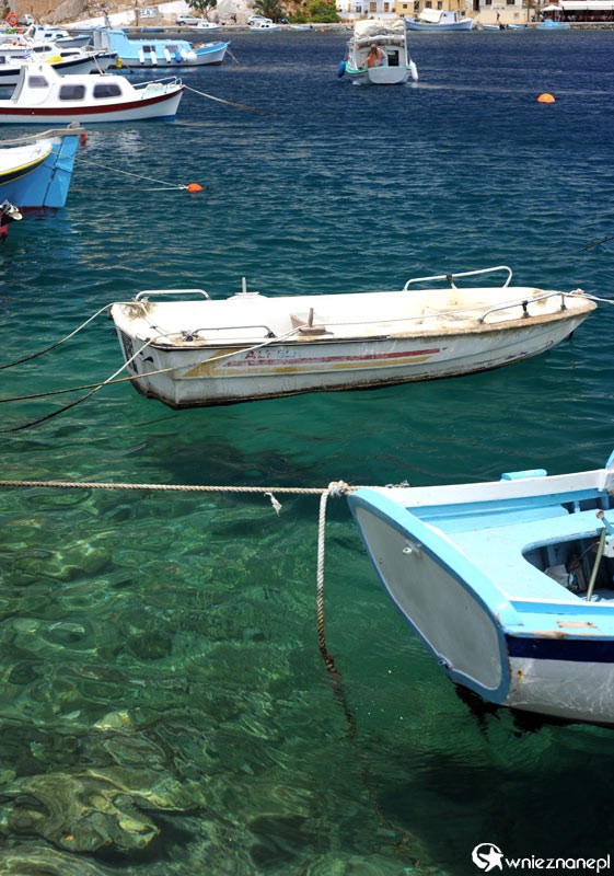 Grecka wyspa Symi. Łódki unoszące się na krystalicznej wodzie.
