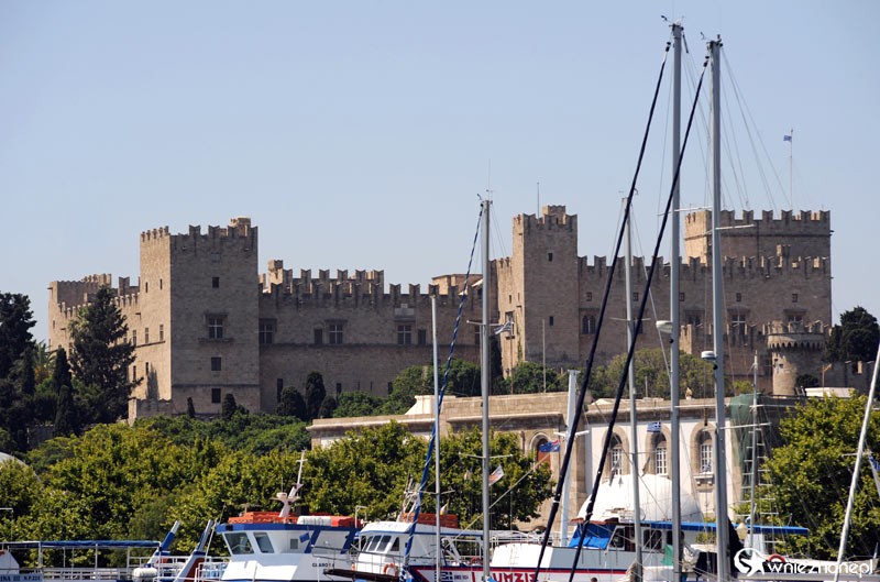 Wyspa Rodos. Miasto Rodos. W tle średniowieczne fortyfikacje górujące nad miastem, widziane z portu Mandraki.