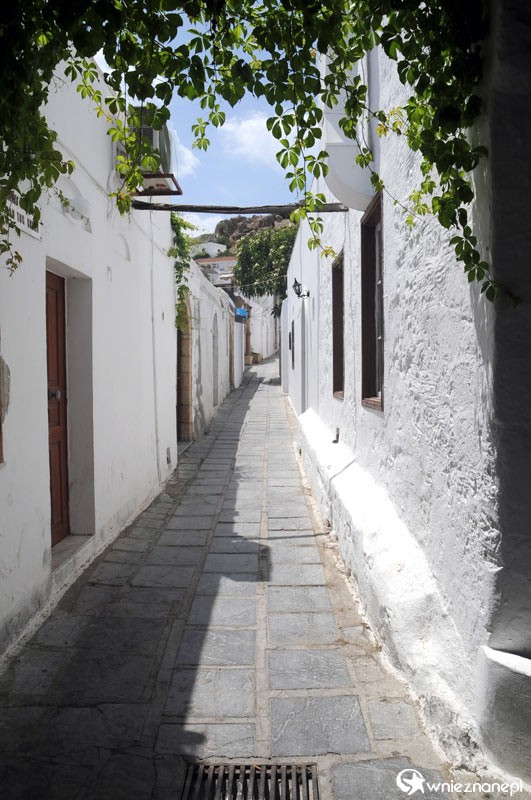 Wyspa Rodos. Wąziutka uliczka w Lindos. Miasto i stare domy zostały wpisane na listę światowego dziedzictwa UNESCO.