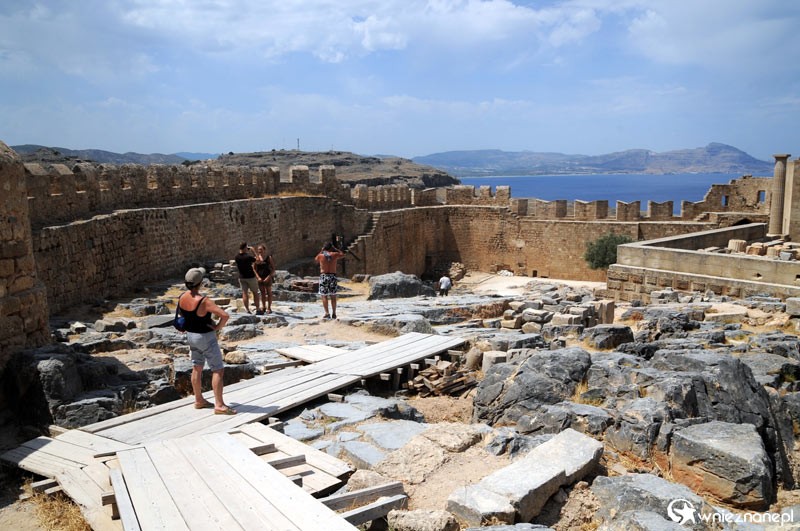 Wyspa Rodos. Akropol w Lindos. Widoczne fragmenty murów obronnych i zabytkowe ruiny. W tle Morze Śródziemne.