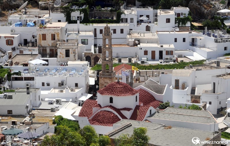 Wyspa Rodos. Zabytkowe Lindos. Na pierwszym planie Kościół Wniebowzięcia Najświętszej Marii Panny. - foto: wnieznane.pl