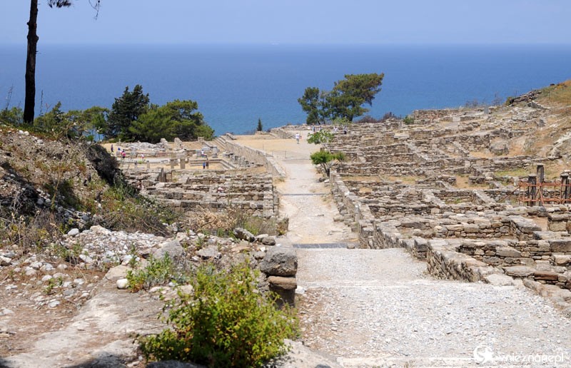 Wyspa Rodos. Starożytne Kamiros - miasto całkowicie zniszczone w wyniku trzęsienia ziemi. Widok z górnej części ruin. W tle Morze Egejskie, którego wybrzeże znajdowało się przed wiekami przy mieście.