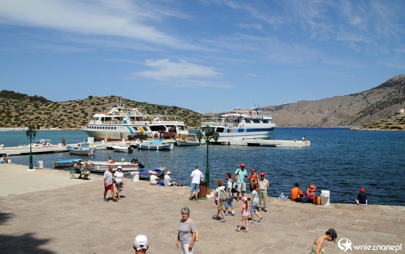 Grecka wyspa Symi. Niewielki port dla statków pasażerskich w pobliżu klasztoru Panoramitis.