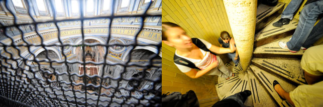 Niesamowite wrażenie robi zaprojektowana przez Michała Anioła kopuła, z której szczytu można oglądać wspaniałą panoramę Watykanu i Rzymu. Na górę można wejść po 551 schodach lub wjechać windą, a następnie wspiąć się po 320 stopniach. Niezależnie od wybranej opcji, trzeba przejść znajdującą się na wysokości 120 m loggię wokół kopuły, skąd widać wnętrze bazyliki. Udaliśmy się więc do kolejki oczekujących na wejście na kopułę. Opcja schodowa kosztuje 5 euro, natomiast opcja winda + schody 7 euro. Do kasy czekaliśmy ok. 30 minut, a kolejne pół godziny zajęło nam oczekiwanie w kolejce do windy i wejście po schodach. Te są bardzo wąskie, a na samej górze korytarz staje się wręcz klaustrofobicznie ciasny. Nie ma możliwości zatrzymać się na dłużej, bo nie da się wyminąć innych osób. Częściowo klatka schodowa biegnie spiralnie, częściowo na wprost. Ciekawy jest moment, kiedy ściany są nachylone pod kątem, a schody nie. Taras widokowy nie jest zbyt duży, a zwiedzających sporo. Za to widok rekompensuje wszystkie niedogodności. Sprytnie rozwiązano problem schodzenia w dół, bowiem schodzi się innym korytarzem niż wchodzi, natomiast winda zjeżdża do... wnętrza bazyliki ;).