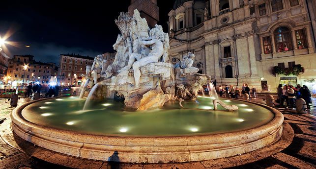 Z Piazza Colosseo autobusem podjechaliśmy do kolejnego słynnego miejsca w Rzymie. Nawet wieczorem na Piazza Navona można spotkać artystów malujących i sprzedających swoje dzieła. Ładnie prezentują się znajdujące przy placu kawiarnie, ale kamienice i kościoły nie są w ogóle oświetlone, chociaż widać było skierowane na nie reflektory. Trzy efektowne fontanny również były podświetlone bardzo słabo, natomiast znajdujący się na środku obelisk wcale. Mimo to plac tętni życiem i ma specyficzny klimat.