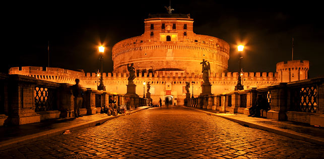 Z Piazza Cavour do zamku Sant' Angelo już tylko kilka kroków. Wieczorem Castel Sant' Angelo prezentuje się naprawdę efektownie. Ładnie oświetlony jest również prowadzący do niego most - Ponte Sant' Angelo, chociaż same figury ustawione wzdłuż balustrady nie są podświetlone. Z mostu rozpościera się ciekawy widok na Via della Conciliazione, prowadzącą do Watykanu, a także na podświetloną kopułę bazyliki.