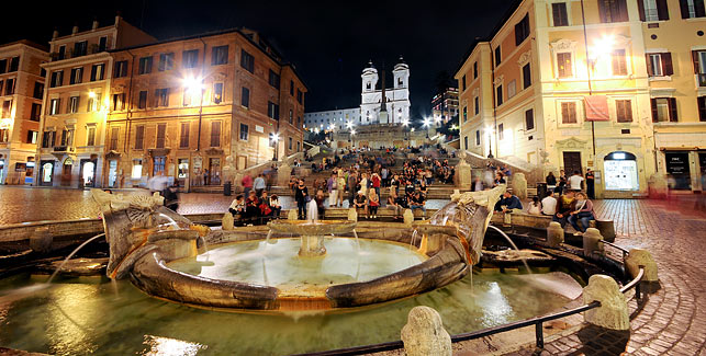 Z Piazza del Popolo udajemy się do innego słynnego miejsca - Piazza di Spagna. Możliwości są dwie - przejechać jedną stację metrem lub przejść pieszo. Jesteśmy już nieco zmęczeni, więc wybieramy metro. Plac Hiszpański wygląda ładnie, szczególnie wysokie palmy w jednym jego końcu. Oczywiście centralnym punktem są słynne schody, mimo późnej pory, pełne ludzi. Trzeba przyznać, że same schody niczym specjalnym się nie wyróżniają, ale oferują ładny widok na miasto. Na górze stoi Chiesa della Santissima Trinita dei Monti (Kościół Najświętszej Trójcy), a u podnóża schodów znajduje się mała, ale ciekawa fontanna Barcaccia, będąca dziełem Lorenzo Berniniego. W okolicy mieści się mnóstwo butików z ekskluzywną odzieżą, obuwiem czy dodatkami, które często odwiedzane są przez znane osoby.