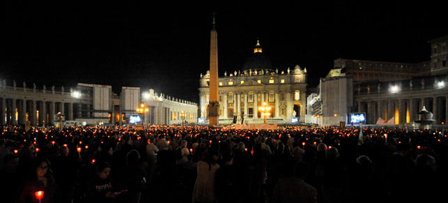 Z Piazza Barberini czerwoną linią metra pojechaliśmy do stacji Ottaviano, skąd już niedaleko do Watykanu. Można przejść pieszo lub dojechać tramwajem czy autobusem do Piazza Citta Leonina i dalej kawałek przejść wzdłuż wysokiego muru aż do wejścia na Plac św. Piotra. Kiedy tam dotarliśmy wieczorem, okazało się, że akurat odbywa się jakaś uroczystość. Plac wypełniał tłum ludzi trzymających w dłoniach świeczki z czerwonymi osłonkami.