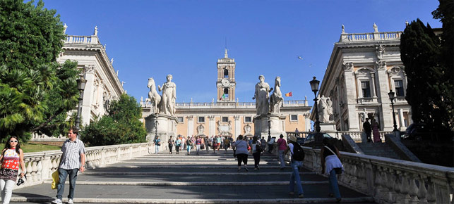Sprzed Grobu Nieznanego Żołnierza kierujemy się na wzgórze kapitolińskie. Tym razem musimy zadowolić się jedynie obejrzeniem go z zewnątrz, bo zwiedzanie znajdujących się w pałacach zabytków zajmuje dużo czasu, którego nie mamy. Pogrążony w cieniu plac pozwala na chwilę oddechu przed dalszym spacerem. Duże wrażenie robią okalające plac potężne rzeźby. Tuż obok znajduje się kościół Santa Maria in Aracoeli z niepozorną fasadą, ale podobno piękny w środku. I on musi jeszcze na nas poczekać...