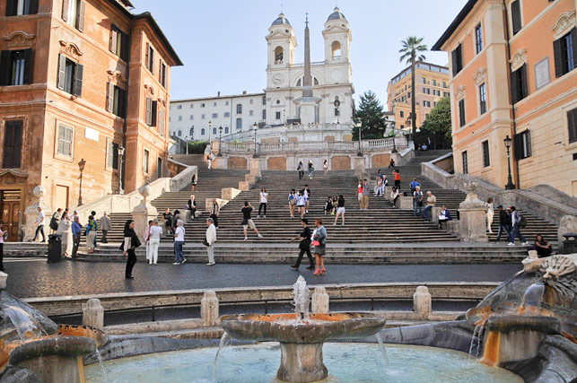 Kolejny dzień rozpoczynamy od Piazza di Spagna i Schodów Hiszpańskich. Zachodzimy też do typowego rzymskiego baru, gdzie miejscowi wpadają na chwilę i w biegu popijają szybkie espresso. Rekordziście zajęło to 4 sekundy! W ciągu 10 minut, jakie tam spędzamy, przy ladzie przewija się kilkadziesiąt osób... My wybieramy bardziej polskie śniadanie i z bułką w ręku przysiadamy na Placu Hiszpańskim.