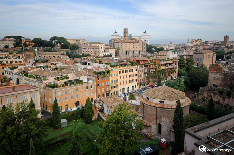 Rzym. Widok ze wzgórza Palatyn na miasto. W tle Kapitol i pomnik Vittorio Emanuele II.