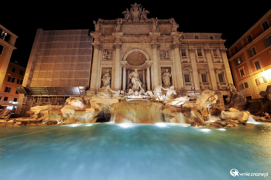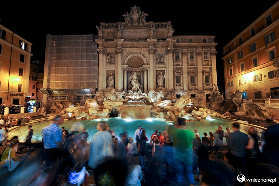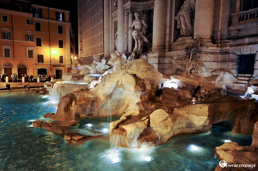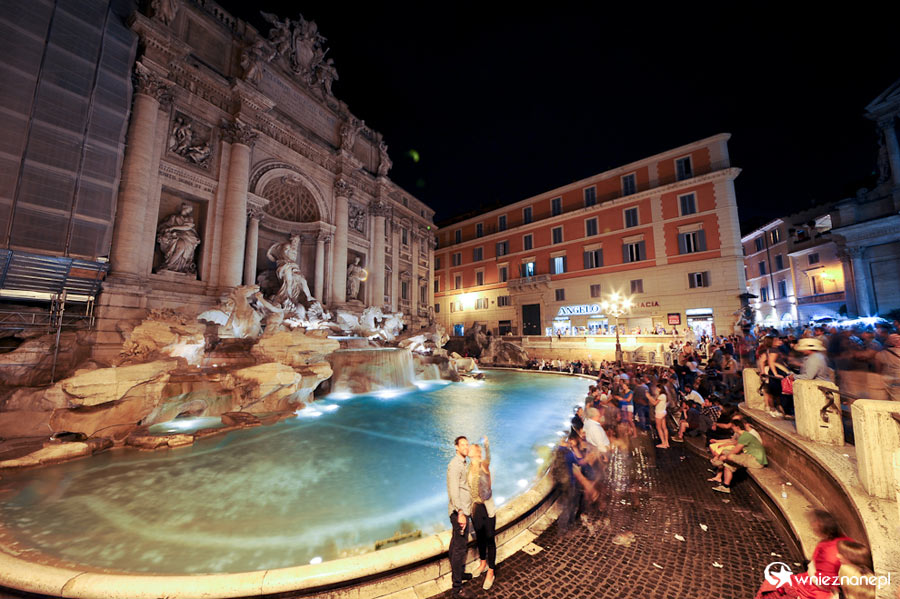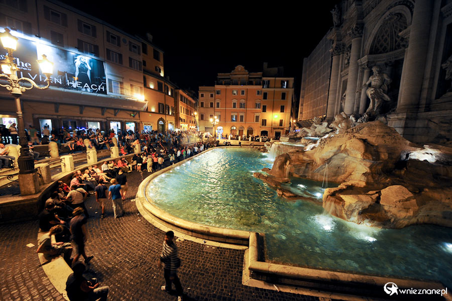 Rzym. Jeden z symboli miasta - niesamowita Fontanna di Trevi, ciesząca się ogromną popularnością także późnym wieczorem.