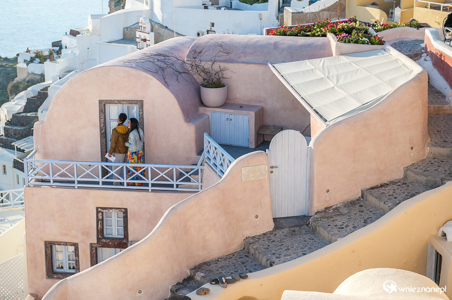 Santorini. Turyści wchodzący do jednego z hoteli w Oi.