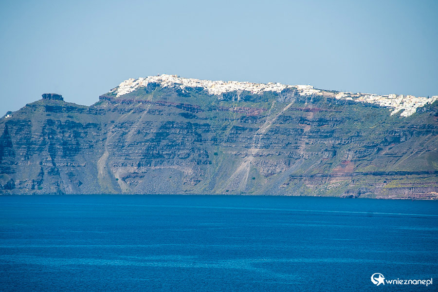 Santorini. Widok na miejscowość Imerovigli. Budynki zawieszone na klifie robią niesamowite wrażenie.
