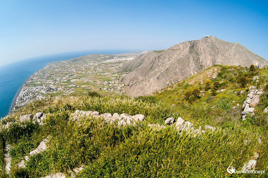 Santorini. Na terenie ruin Starożytnej Thery. Widok na najwyższy szczyt wyspy, Profitis Ilias.