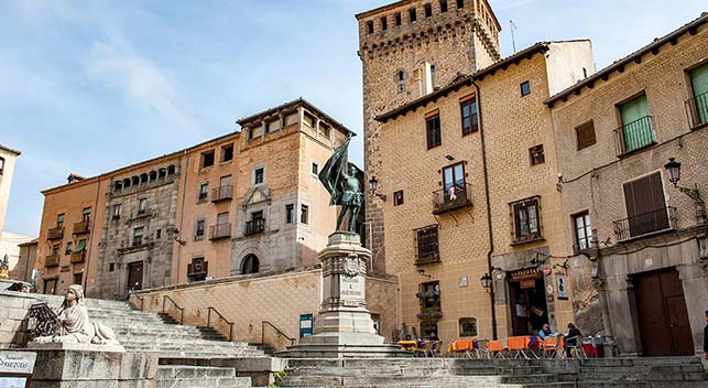 Głównym deptakiem Calle de Cervantes i dalej Calle Juan Bravo ruszamy w stronę Plaza Mayor i katedry. Po obu stronach ciągną się sklepiki, cukiernie czy butiki. Wkrótce dochodzimy do jednego z ciekawszych miejsc - Plaza de San Martin. Plac połączony jest z innym - Plaza de Medina del Campo. Oba otoczone są zabytkowymi budynkami, jak np. XIV-wieczna wieża Torreon de Lozoya, kilka szlacheckich budynków mieszkalnych, a także dawne więzienie, a obecnie biblioteka. Na środku placu stoi pomnik Juana Bravo, a z drugiej strony Kościół San Martin. Kiedy patrzymy na plac, przywodzi on na myśl swoim wyglądem niektóre włoskie placyki.