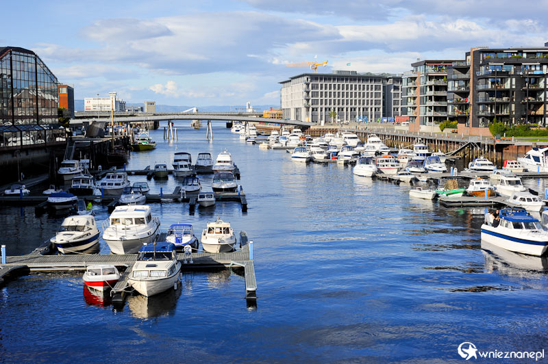 Trondheim. Hotel Radisson i łódki cumujące wzdłuż rzeki.