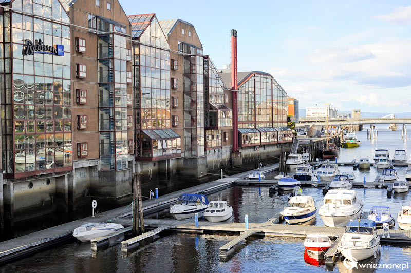 Trondheim. Hotel Radisson i łódki cumujące wzdłuż rzeki.