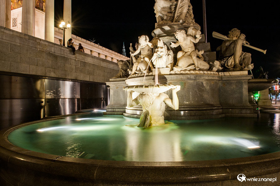 Wiedeń. Fontanna Pallas Atena przed Parlamentem nocą.