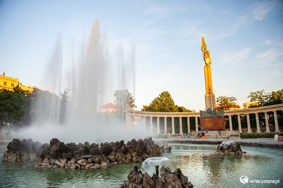 Wiedeń. Fontanna Hochstrahlbrunnen i Pomnik Bohaterów Armii Czerwonej.