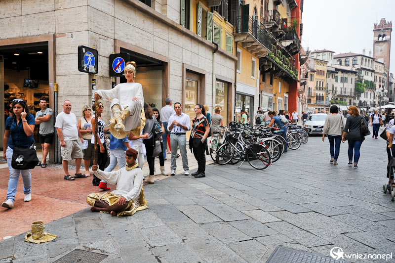 Werona. Artyści uliczni po drodze do Casa di Giulietta (Domu Julii).