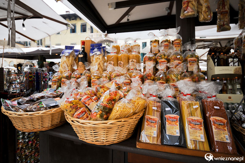 Werona. Piazza delle Erbe (Plac Ziół). Stragan z włoskim makaronem.