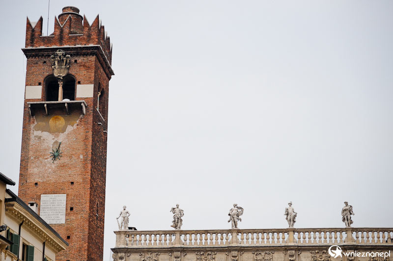 Werona. Torre del Gardello i zwieńczenie fasady Palazzo Maffei - posągi Herkulesa, Jowisza, Wenus, Merkurego, Apolla i Minerwy.