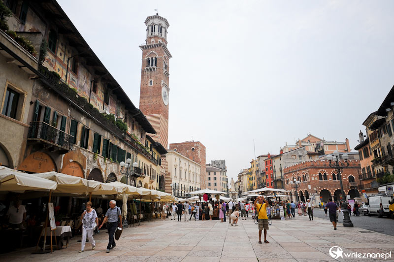 Werona. Piazza delle Erbe (Plac Ziół), wyłożony marmurowymi płytami. Po lewej wieża Torre dei Lamberti.