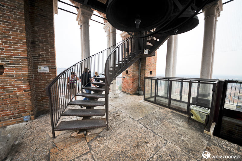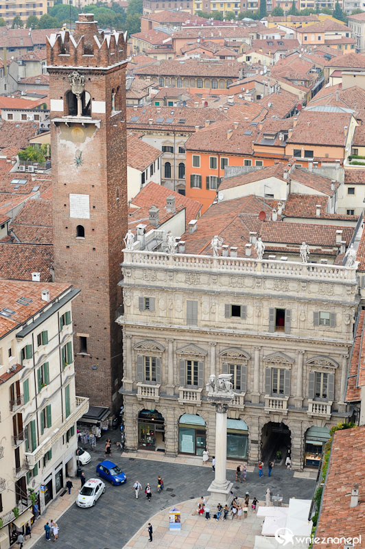 Werona. Widok z Torre dei Lamberti na Piazza delle Erbe, Palazzo Maffei, kolumnę z symbolem Republiki Weneckiej i Torre dell Gardello.