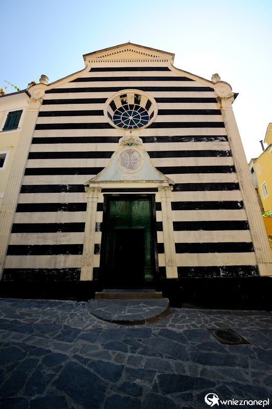 Cinque Terre. Charakterystyczny biało-czarny kościów w zabytkowej części miejscowości Monterosso.