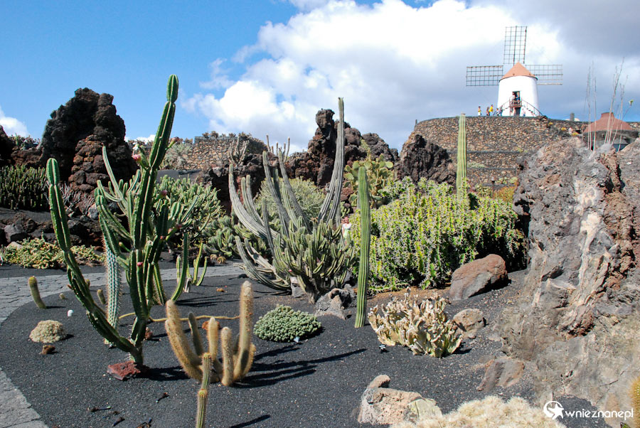 Wyspy Kanaryjskie: Ogród kaktusów z widocznym w tle zabytkowym młynem