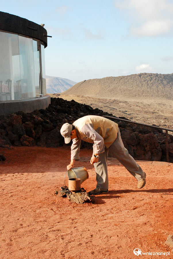 Wyspy Kanaryjskie: Pracownik Parku Timanfaya rozpoczyna prezentacje temperatury lawy